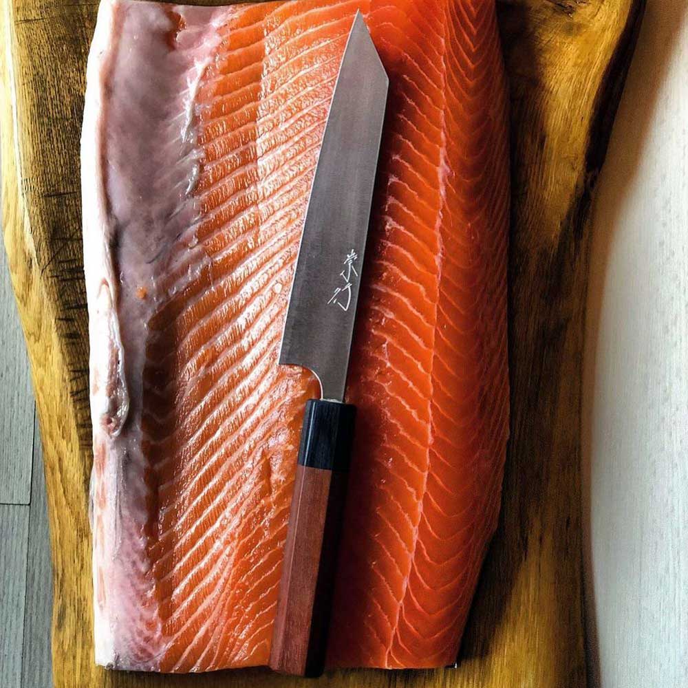 אחיזת הסכין הזאת לדעתי היא אחיזה שהיא קרובה מאוד ללהב כאשר אם צריך משהו מדויק מאוד אצבע אחת יכולה להיות ממש לאורך הלהב. אחת הטכניקות בהן הביצועים של הסכין הזאת היו פנומנליות הן פריסה של חומר גלם תוכדי שמירה על הצורה הטבעית של חומר הגלם. אולי הדוגמה הטובה ביותר היא אבוקדו אם אני רוצה לפרוס אותו ולשמור על צורתו בכדי ליצור מניפה על ידי לחיצה על האבוקדו הלהב הדק והדיוק עוזרים לפרוס מבלי שהאבוקדו זז.
