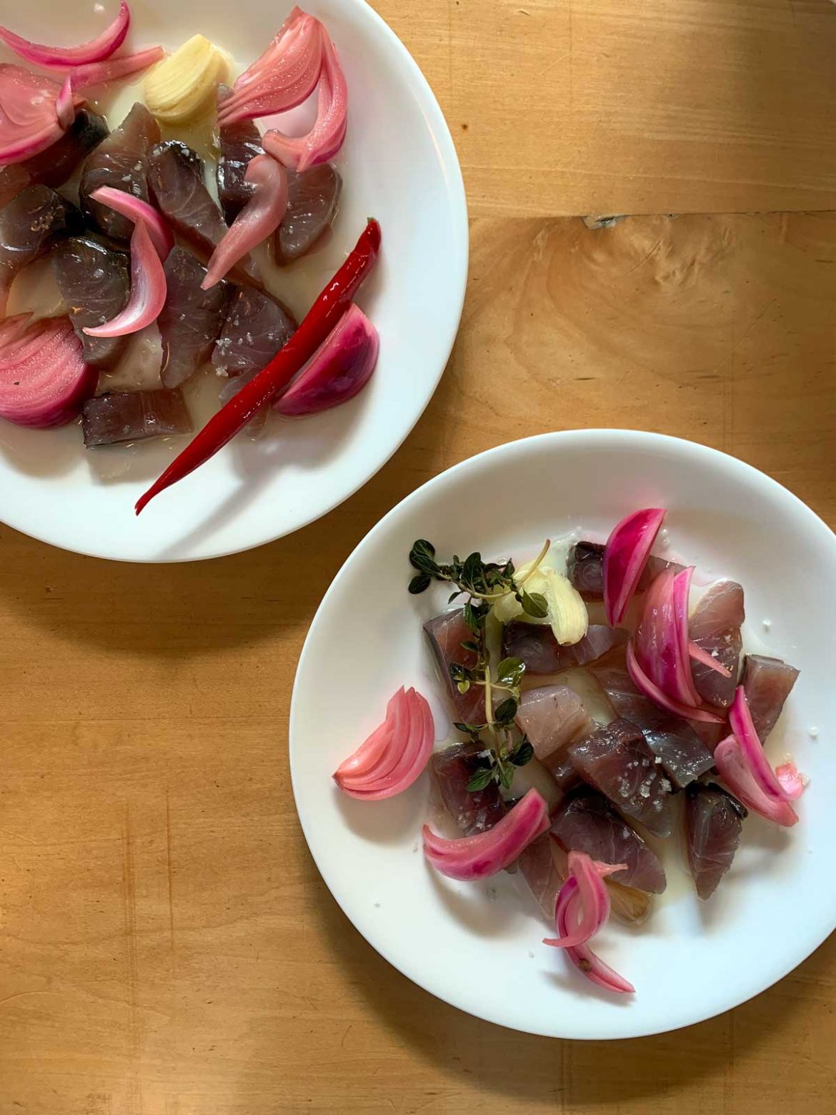 - חותכים את הדג לרצועות בעובי ס״מ אחד בעזרת סכין מטבח, ומניחים בצנצנת או קופסת זכוכית עם מכסה שנסגר טוב.
